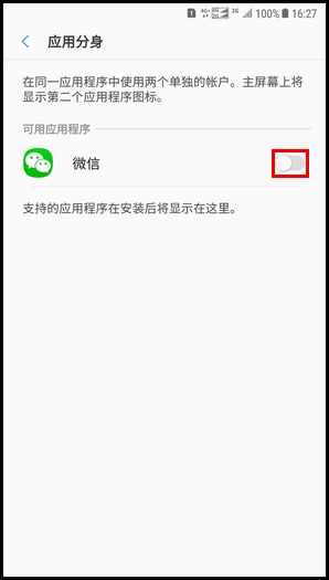 4.点亮想要开启应用分身软件右侧的【滑块】开关,这里以【微信】为例介绍。 (注:支持的应用程序在安装后将显示在这里。)