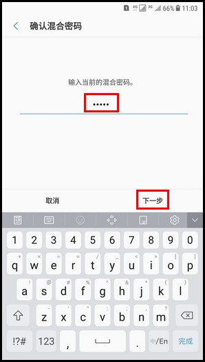 4.使用预设的屏幕解锁方式解锁屏幕,这里以输入混合密码为例,然后点击【下一步】。(注:必须使用预设的解锁方式解锁进入,使用指纹无法进入。)