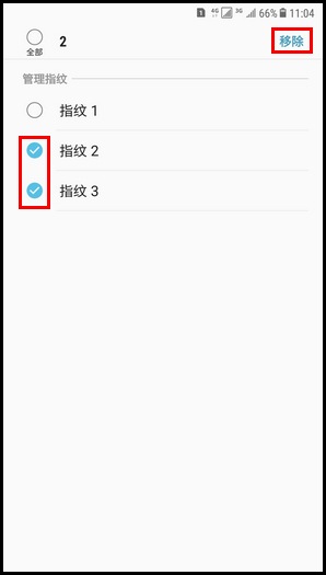 6.将想要删除的指纹勾选,然后点击【移除】。(若需要将所有指纹删除,可以勾选上方的【全部】。)