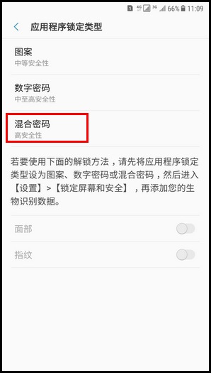 5.选择应用程序锁定类型,分别有“图案”“数字密码”“混合密码”“指纹”“面部”,此处以选择【混合密码】为例。(注:混合密码必须包含至少4个字符,其中包括至少一个字母。)
