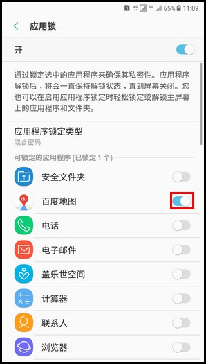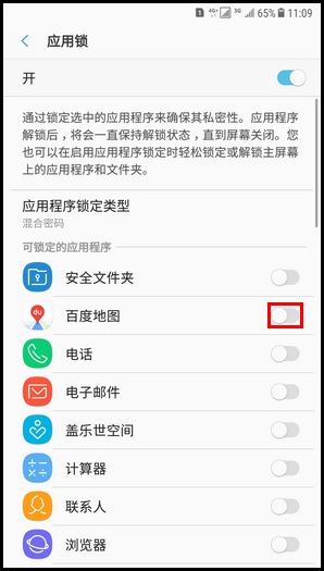 8.应用锁功能已开启,这里以锁定“百度地图”为例,点亮“百度地图”右侧【滑块】开关即可。