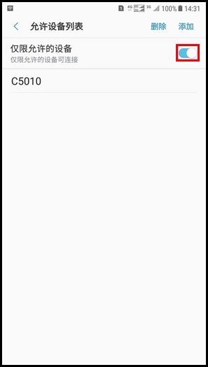 10.一个设备已添加。点亮“仅限允许的设备”右侧的滑块开关。