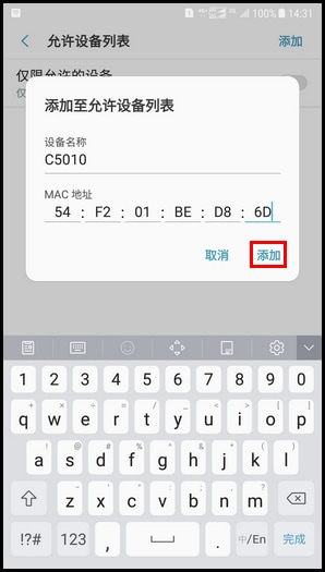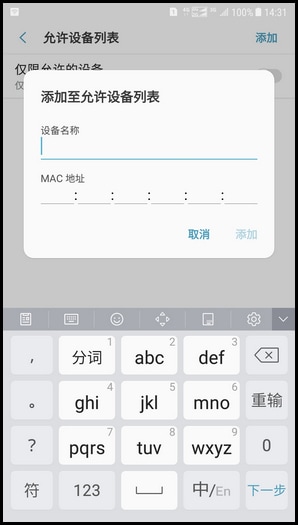 8.输入添加至允许设备的名称及MAC地址。(注:手机MAC地址查看路径:WLAN-更多-高级设置-MAC地址。)