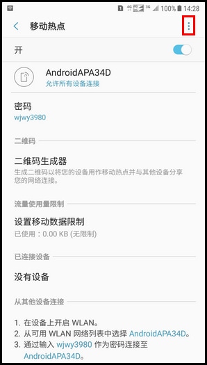 6.此时,另一台设备就可以通过WLAN搜索该热点,进行连接。如果您想要配置移动热点的设置,请点击【┆】图标。(注:若您开启了WLAN,将弹出“启用移动热点将关闭WLAN”的提示,阅读后,点击【确定】即可。)