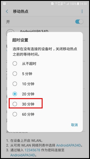 8.设置完成后,若30分钟内没有设备连接,该WLAN热点将自动关闭。