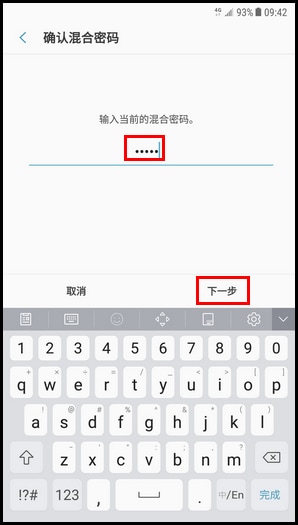 4.使用预设的屏幕解锁方式解锁屏幕,这里以输入混合密码为例,然后点击【下一步】。