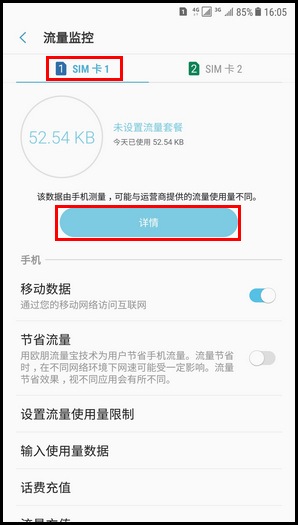 4.选择想要查看流量使用情况的SIM卡,这里以【SIM卡1】为例,然后点击【详情】。