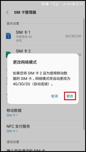 6.弹出“更改网络模式”的提示时,点击【更改】。(如果选择【取消】,则无法切换卡的上网功能)