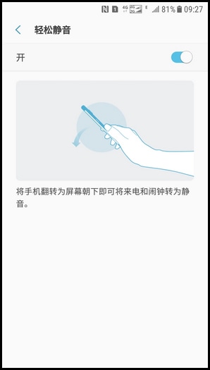轻松静音功能是指当您有来电或闹钟响铃时,将手机翻转为屏幕向下以关闭来电或闹钟的声音,若想开启该功能,请按以下步骤操作: