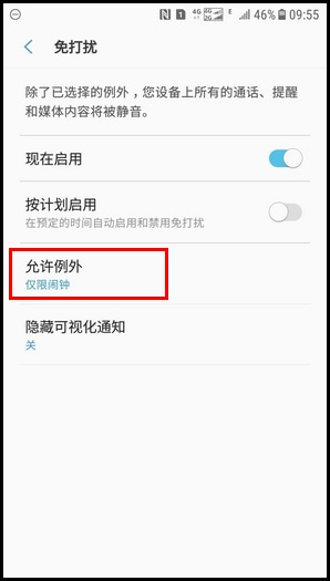5.点击【允许例外】。(如果您不希望某项功能的提示转为静音,可以将其设置为例外项。)