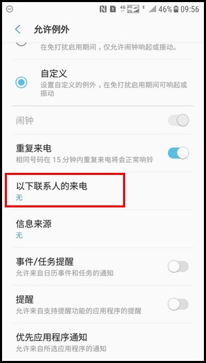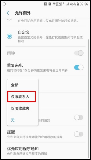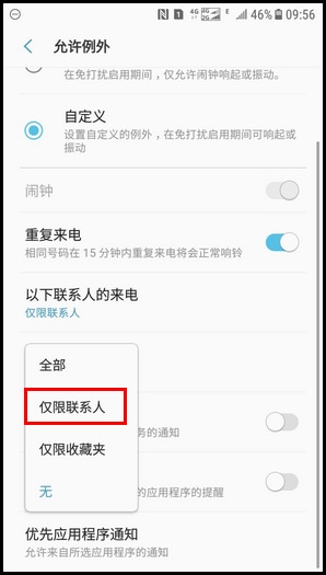 8.点击【以下联系人的来电】,可以设置允许例外的来电,这里以选择【仅限联系人】为例。(注:非允许人的来电将转为静音。)