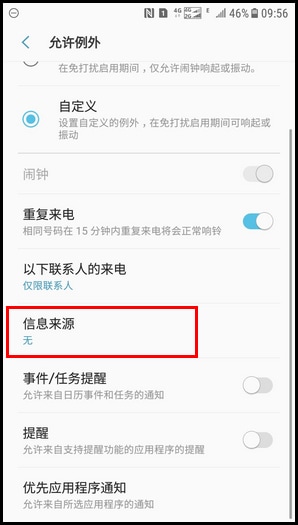 9.点击【信息来源】,可以设置允许例外的信息,这里以选择【仅限联系人】为例。(注:非允许人的信息提示音将转为静音。)