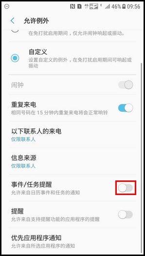 10.点亮“事件/任务提醒”右侧【滑块】开关,可开启允许来自日历事件和任务的通知。(若不开启该功能,S日历的通知和其他日历事件通知将转为静音。)