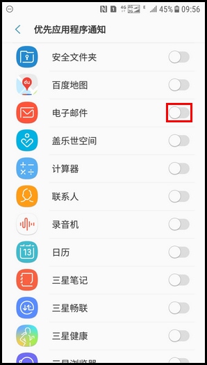 13.选择一个应用程序设置为优先打扰,这里以点亮“电子邮件”右侧滑块开关为例。(注:在免打扰模式开启时,将允许电子邮件通知声音/振动正常响起。)