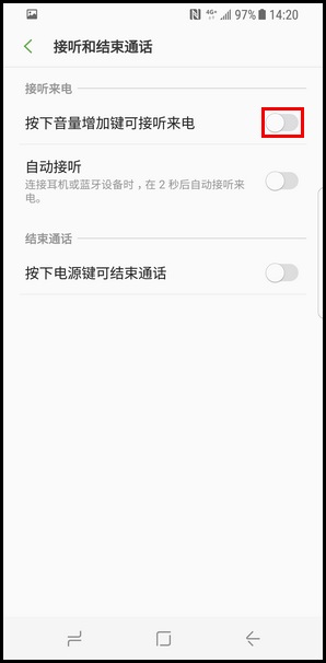 4.点击【按下音量增加键可接听来电】右侧滑块,亮色代表开启。