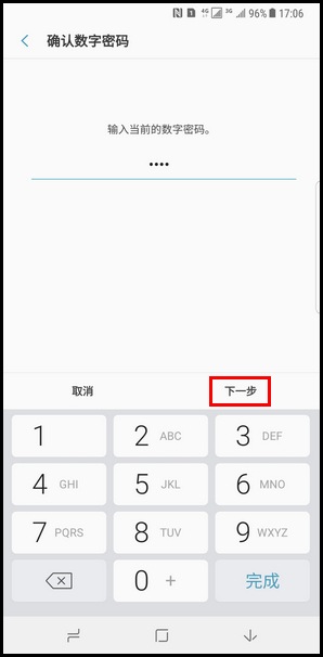 4.使用预设的屏幕解锁方式解锁屏幕。这里以输入数字密码为例,然后点击【下一步】。