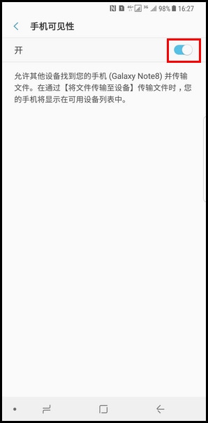 开启手机可见性功能后,在通过【将文件传输至设备】传输文件时,您的手机将显示在可用设备列表中,以便与您共享内容。开启方法如下: