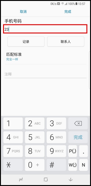 8.输入需要阻止的电话号码。 (注:您也可以从【记录】或【联系人】中选择需要阻止的号码进行添加。)