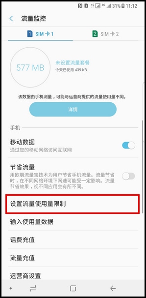 4.点击【设置流量使用量限制】。 (注:若安装了两张SIM卡,请先选择要设置的SIM卡。)