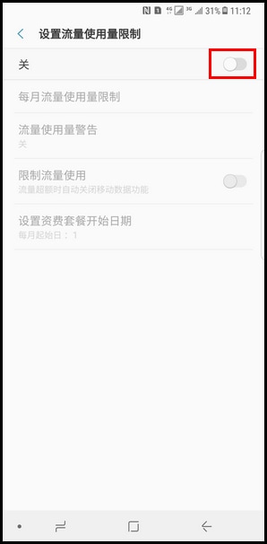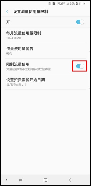 12.若想设置设备在流量超额时自动关闭移动数据功能,点亮【限制流量使用】右侧滑块开关开启该功能。