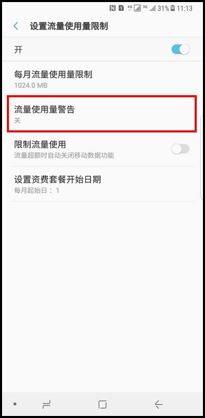 8.点击【流量使用量警告】。