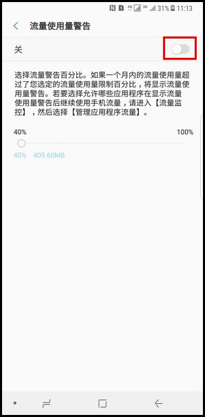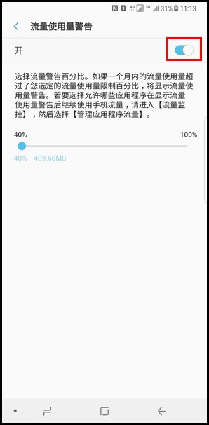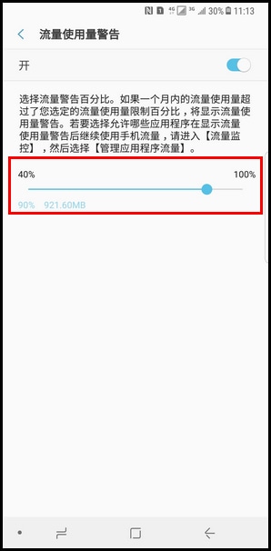 10.向右滑动【圆点】图标,可调整流量警告百分比。如果一个月内的流量使用量超过了您选定的流量使用量限制百分比,将显示流量使用量警告。