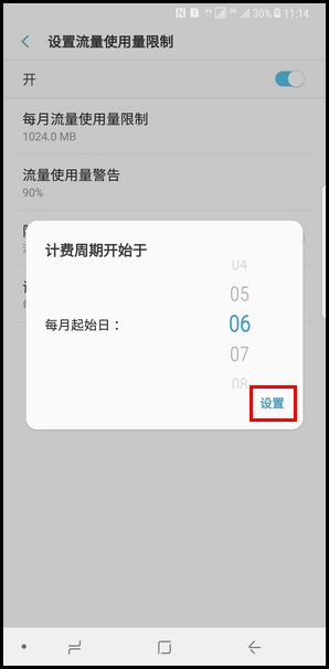 13.若想更改监测期的每月重置日期,点击【设置资费套餐开始日期】,设置使用流量计算起始日期后,点击【设置】即可。