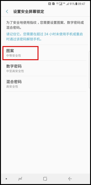 5.设置安全屏幕锁定方式,这里以选择【图案】为例。