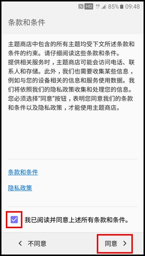 4.阅读主题商店的条款和条件,勾选“我已阅读并同意上述所有条款和条件”后,点击【同意】。