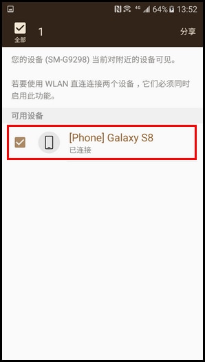 5.点击需连接设备,这里以【Galaxy S8】为例。 (注:在Galaxy S8手机上点击【连接】后即可通过WLAN直连传输文件。)