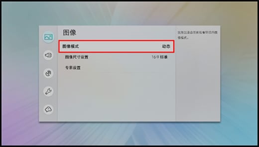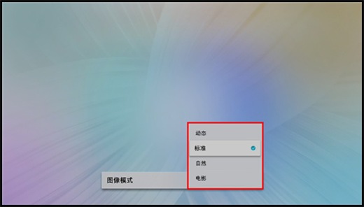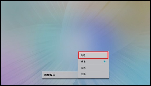6.此时,有四种图像模式供您选择,分别为动态、标准、自然和电影,您可以按【方向】键,向下/向上选择最适合观看环境的图像模式,按【确认】键。