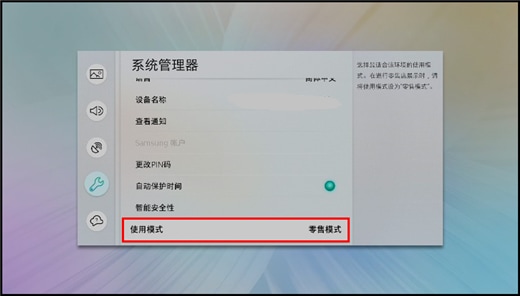 当电视设置了商场模式(零售模式)后,屏幕上会显示此款电视的卖点信息,并且调整的参数每隔5分钟或重新开机会自动恢复。