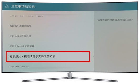 7.进入注意事项和说明后,按【方向 】键,向下选择【播放照片、视频或音乐文件之前必读】,如下图。