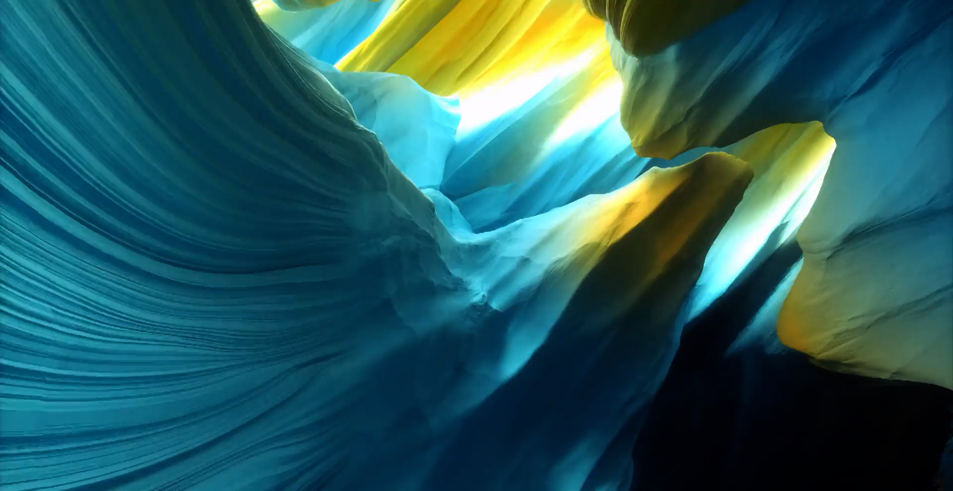 视线在冰川等弯曲的结构中放大,冰川的颜色蓝中带黄。视线到达一片梦幻般的粉色和橙色的草地和灌木丛。画面切换至云层和海浪的鸟瞰图。云层部分散开,展现出一幅超凡脱俗的蓝色景观,雾气缭绕。