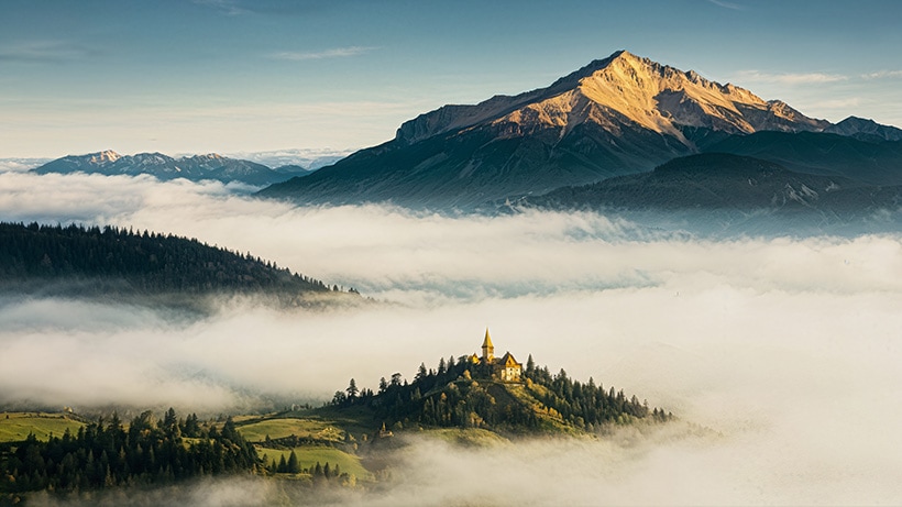 一位女性被气泡包围,气泡上显示着诸如“派对氛围”、“孤独”、“自然”、“欢乐假期”、“放松时刻”、“放松”、“怀旧”、“兴奋”、“装饰”、“把握今天”、“激励我”和“宁静”等提示。气泡被风景图像取代。选中了一张由人工智能生成的内容图像,展示了彩虹与雪山。