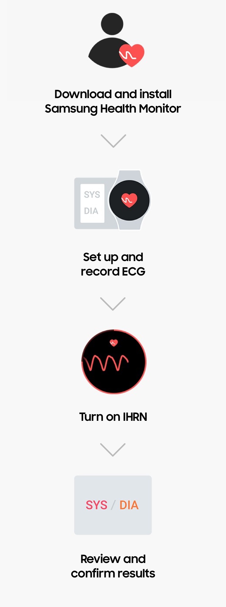 An electrocardiogram (ECG) is a test that measures your heart's electrical activity to create a recording of your heart rate and rhythm. The Irregular Heart Rhythm Notification (IHRN) feature periodically measures your heart rate and notifies you to take an ECG if it detects an irregular rhythm suggestive of atrial fibrillation.
